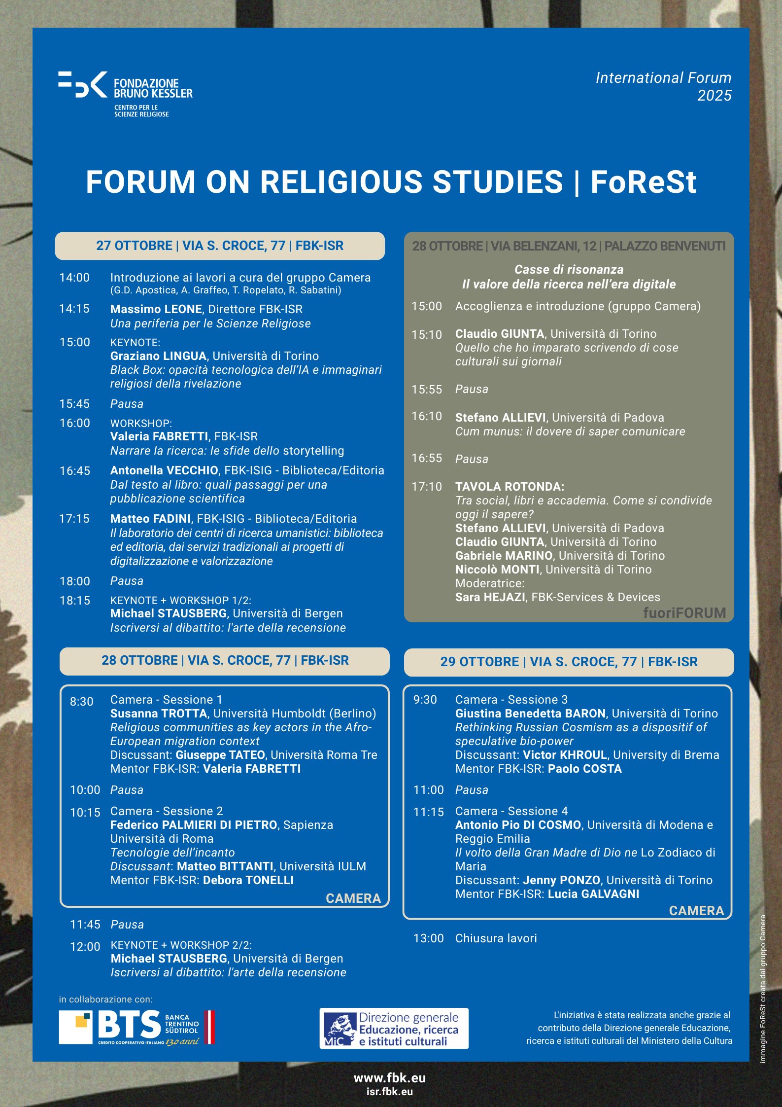 The Forum on Religious Studies – FoReSt 2025 is an event organized by FBK-ISR in partnership with Banca per il Trentino-Alto Adige/Südtirol. It is designed for doctoral students and early-career researchers, offering them an opportunity to engage in discussions and debates with experienced researchers and lecturers, and to present their own research.