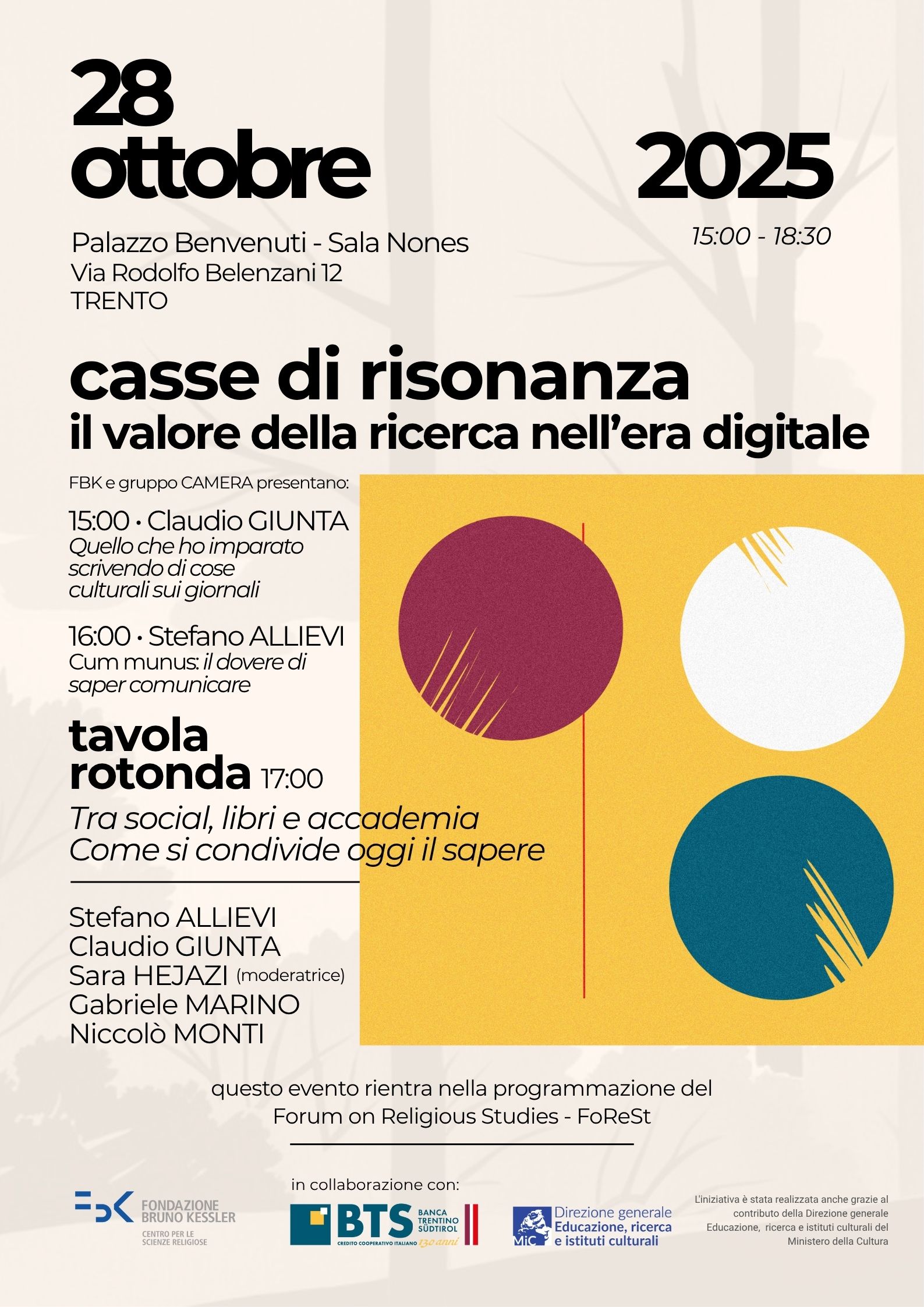 nell’ambito dell’evento FoReSt – Forum on Religious Studies 2025, siamo lieti di invitarvi all’incontro “Casse di risonanza. Il valore della ricerca nell’era digitale”, organizzato da FBK – Centro per le Scienze Religiose (ISR), che si terrà martedì 28 ottobre 2025, dalle 15:00 alle 18:30, presso Palazzo Benvenuti – Sala Nones, Via Rodolfo Belenzani 12, Trento.